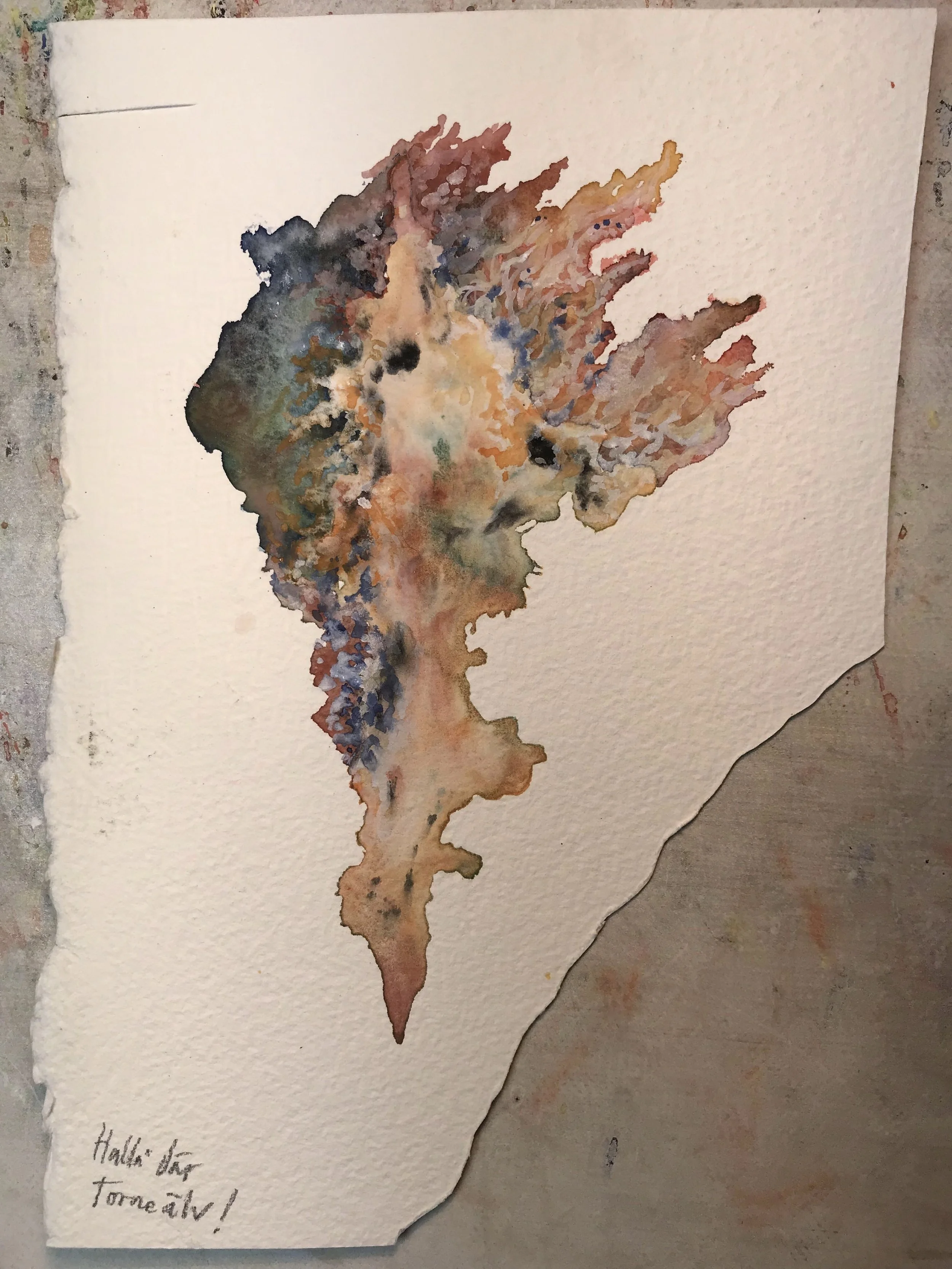 Skönt att betrakta älven varje dag. Skönt att sitta i väderstationen och inte ha det för varmt. Jag hittade två pappmuggar i skräpet som jag kunde ha vatten i när jag målade. Perfekt. Jag hade med mig målarpapper i olika storlekar, en för varje dag. Ja, där satt jag å viftade med min känsliga konstnärspensel och var viktig. Eller det gjorde jag inte alls. Jag satt och försökte ingenting. Skönt. Men svårt. Man ska vara så himla viktig hela tiden som konstnär. Försökte låta älven styra vad jag målade. Försökte att inte vara så duktig och måla precis hela tiden. Sen fick jag försöka övertyga mig själv om att det inte gjorde något att jag gjorde så lite och att det jag gjorde inte blev som det skulle.